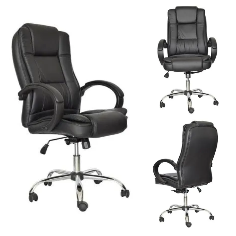 Espaldar alto y asiento de espuma laminada tapizado en cuero sintético, brazos fijos tapizados y estructura en polipropileno brindan resistencia y comodidad. Mecanismo LAP doble palanca y perilla de tensión que permite una regulación personalizada, base de metal cromado y ruedas de nylon que aseguran estabilidad y movilidad.